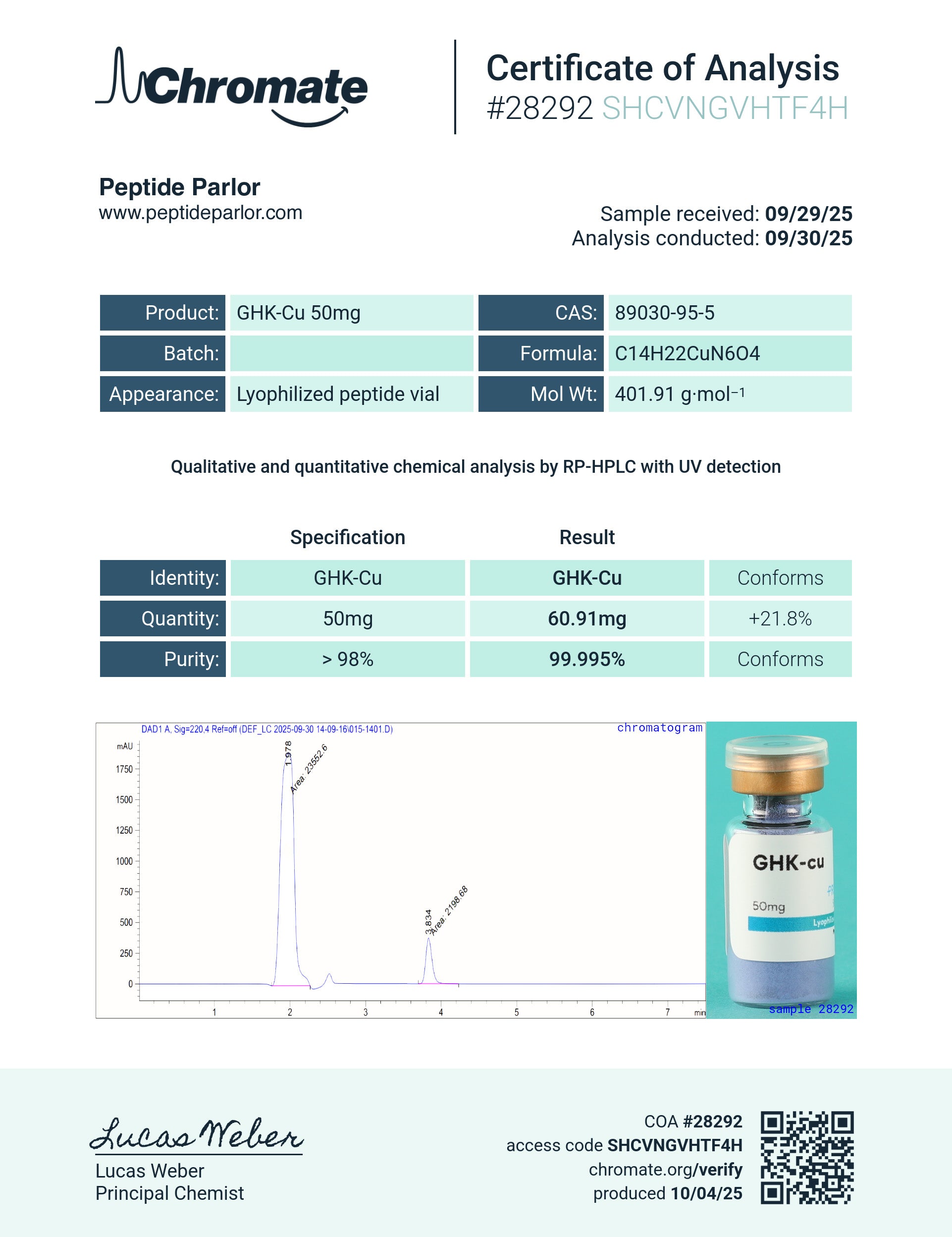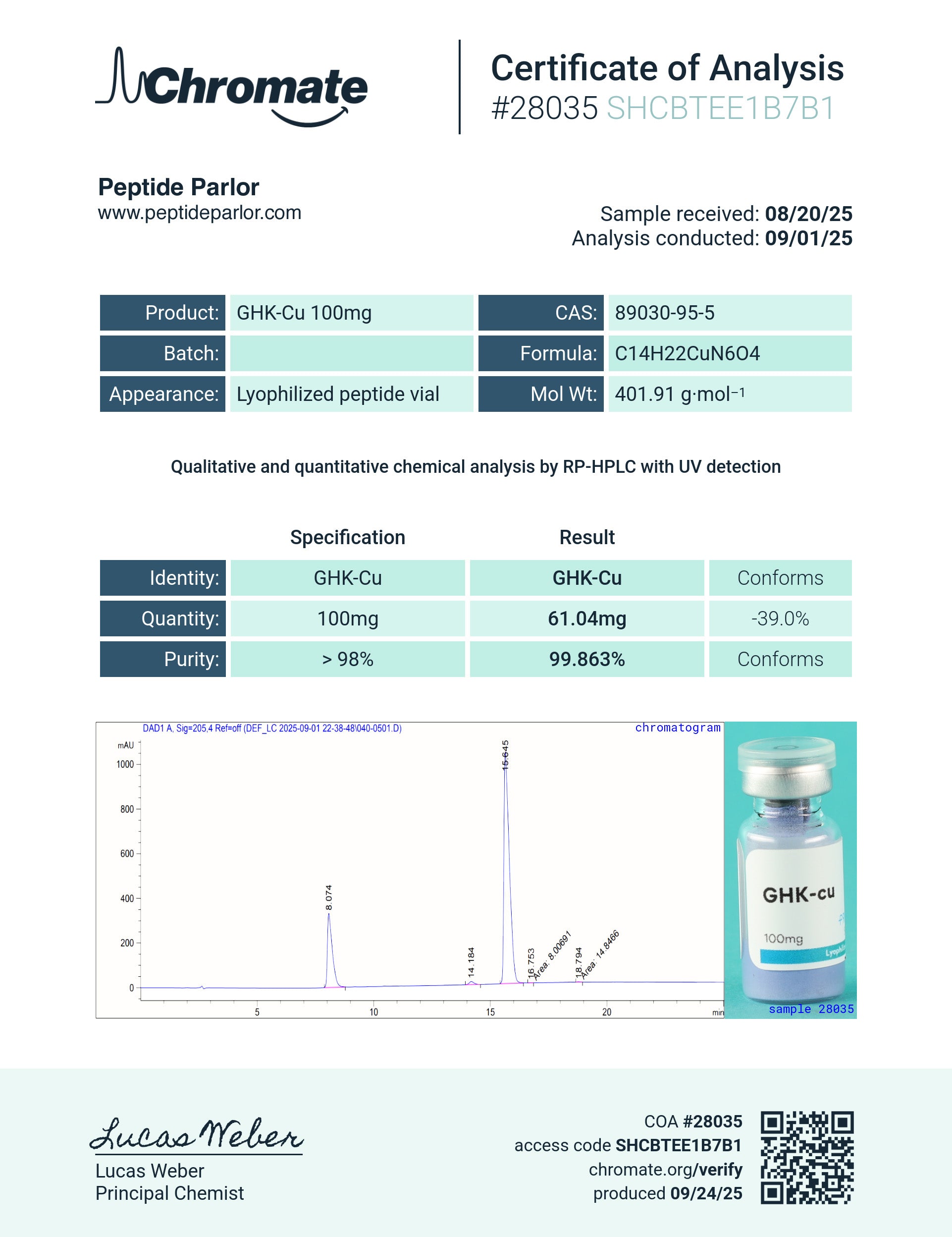 GHK-Cu is a tripeptide complexed with copper widely studied for its role in tissue repair, collagen synthesis, and anti-aging effects. It supports research on skin regeneration, wound healing, and cellular rejuvenation, making it a valuable peptide for regenerative and cosmetic studies.